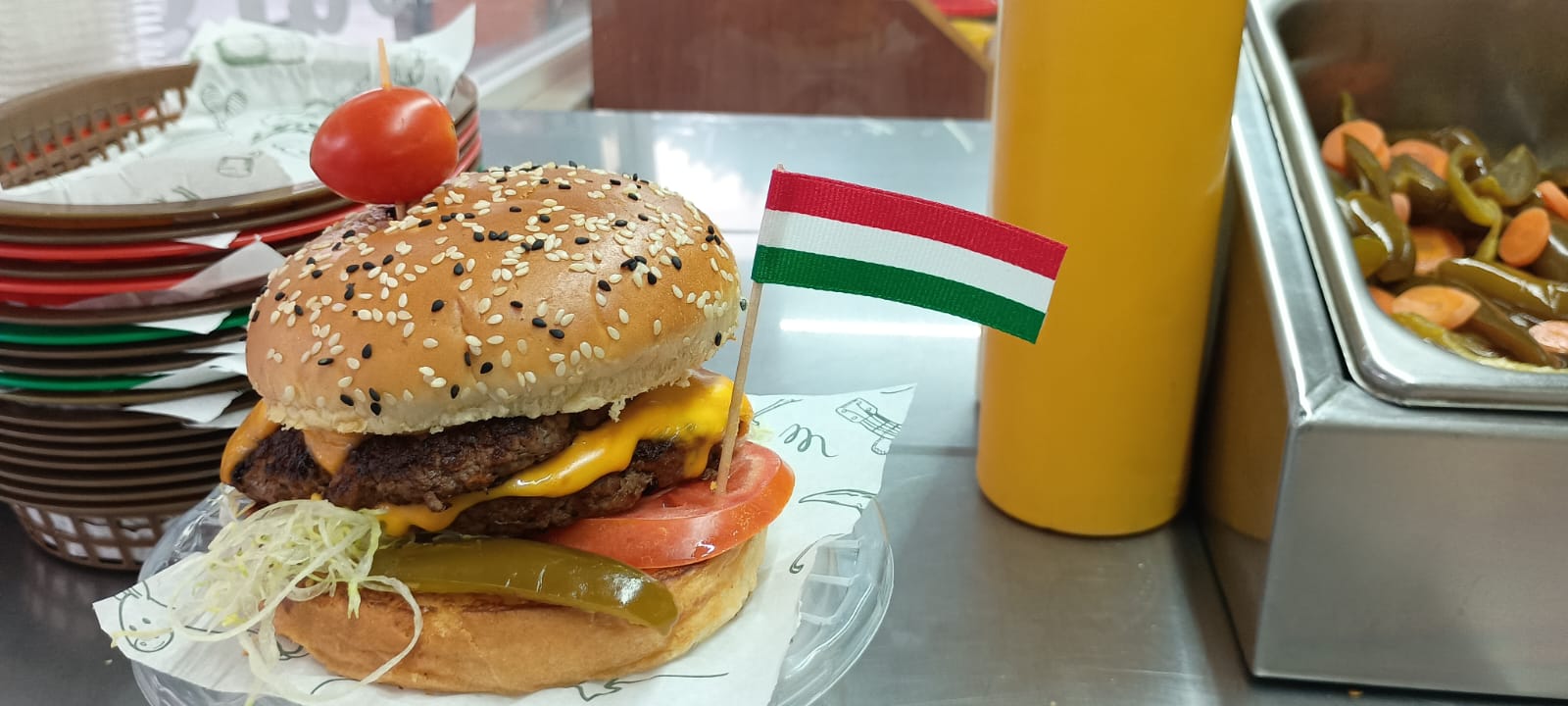 120 gramos de deliciosa carne de res acompañada de lechuga, jitomate, chiles en vinagre, mayonesa y mostaza